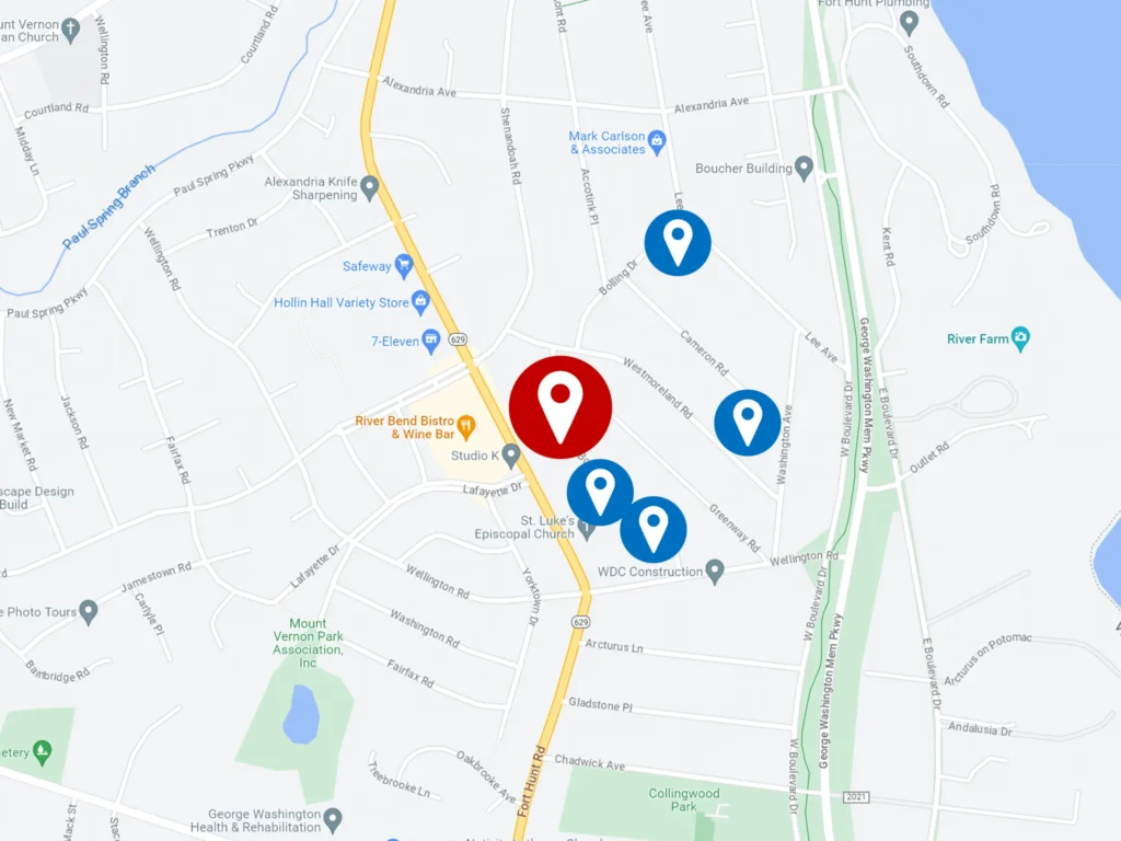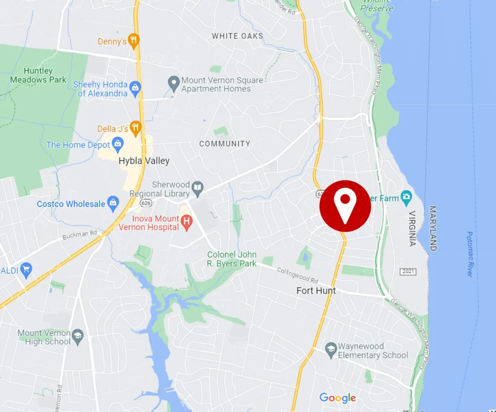 This property is located in the Wellington Estates neighborhood of Alexandria, Virginia. This quiet, established neighborhood has a mix of well-maintained older homes and heavily renovated homes with lots ranging from 10th-acre to 3rd-acre. Wellington Estates is a residential neighborhood that has a few shopping and dining opportunities within walking distance. Just an 8-minute drive away is Hybla Valley’s large commercial center, giving residents nearby amenities, but with the necessity of a car. This combination of walkable and drivable amenities gives Wellington Estates a Walkability Score of 54 (“Somewhat Walkable”). This neighborhood’s location just 30 minutes south of the heart of DC and a 15-minute drive across the river to National Harbor makes it highly desirable. This neighborhood enjoys the benefit of being quiet and tucked away from the bustle of the city while remaining at arms-length to all of the District’s major draws.